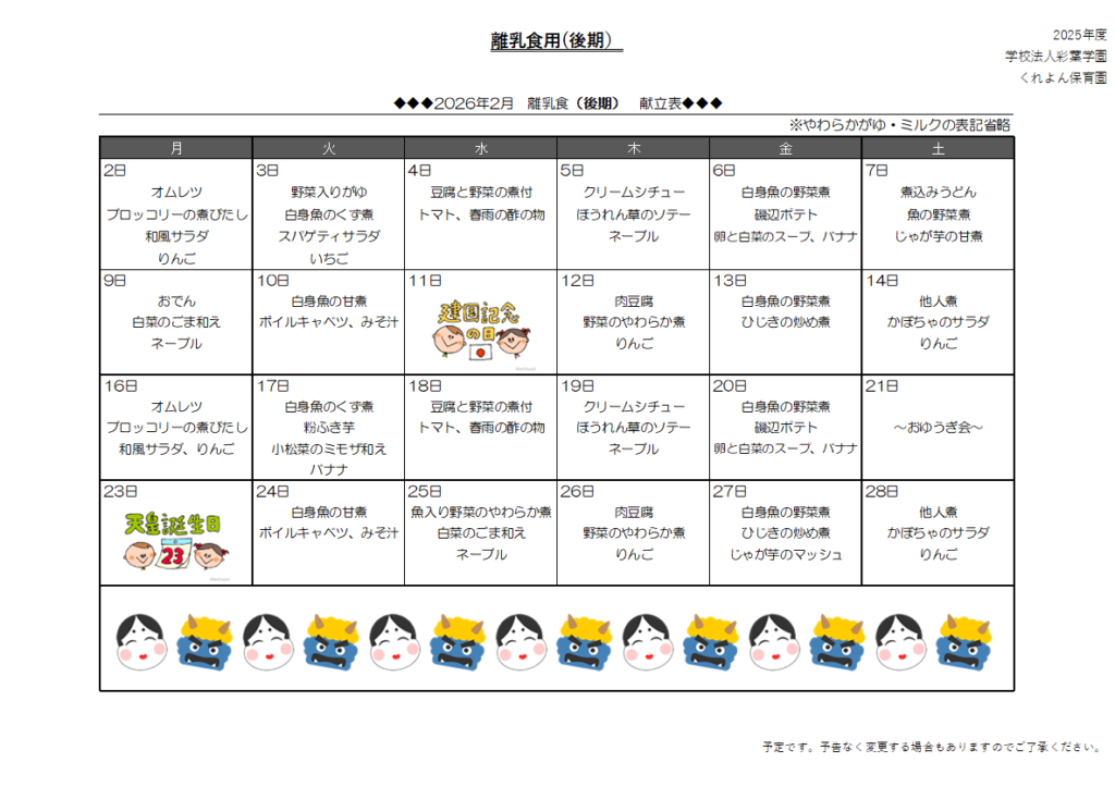 2月の献立表 彩葉学園・呉中央幼稚園・くれよん保育園の給食🍚🥄 2026 3/03 給食献立 呉中央幼稚園・くれよん保育園の給食(普通食) くれよん保育園の離乳食(中期) くれよん保育園の離乳食(後期) 給食献立 よかったらシェアしてね! URLをコピーしました! URLをコピーしました! R7年度2月号 こどもの発達に関すること R7年度3月号 こどもの花粉症と喘息について 🤧 関連記事 3月の献立表 彩葉学園・呉中央幼稚園・くれよん保育園の給食🍚🥄 2026-03-03 1月の献立表 彩葉学園・呉中央幼稚園・くれよん保育園の給食🍚🥄 2025-12-31 12月の献立表 彩葉学園・呉中央幼稚園・くれよん保育園の給食🍚🥄 2025-11-28 11月の献立表 彩葉学園・呉中央幼稚園・くれよん保育園の給食🍚🥗🥄 2025-10-31 10月の献立表 彩葉学園・呉中央幼稚園・くれよん保育園の給食🍚🥗🥄 2025-09-29 9月の献立表 彩葉学園・呉中央幼稚園・くれよん保育園の給食 2025-08-31