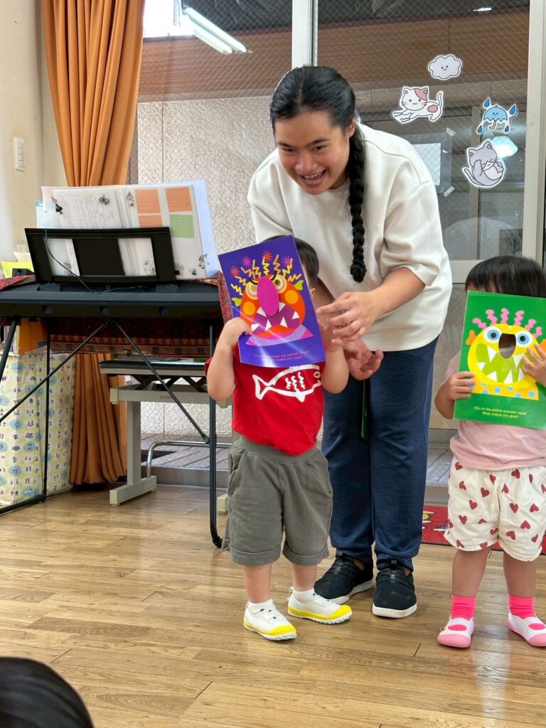 幼稚園のたけ組さん、保育園のたけ組さんが一緒に歌ったり踊ったりと、英語の時間を楽しく過ごしています。